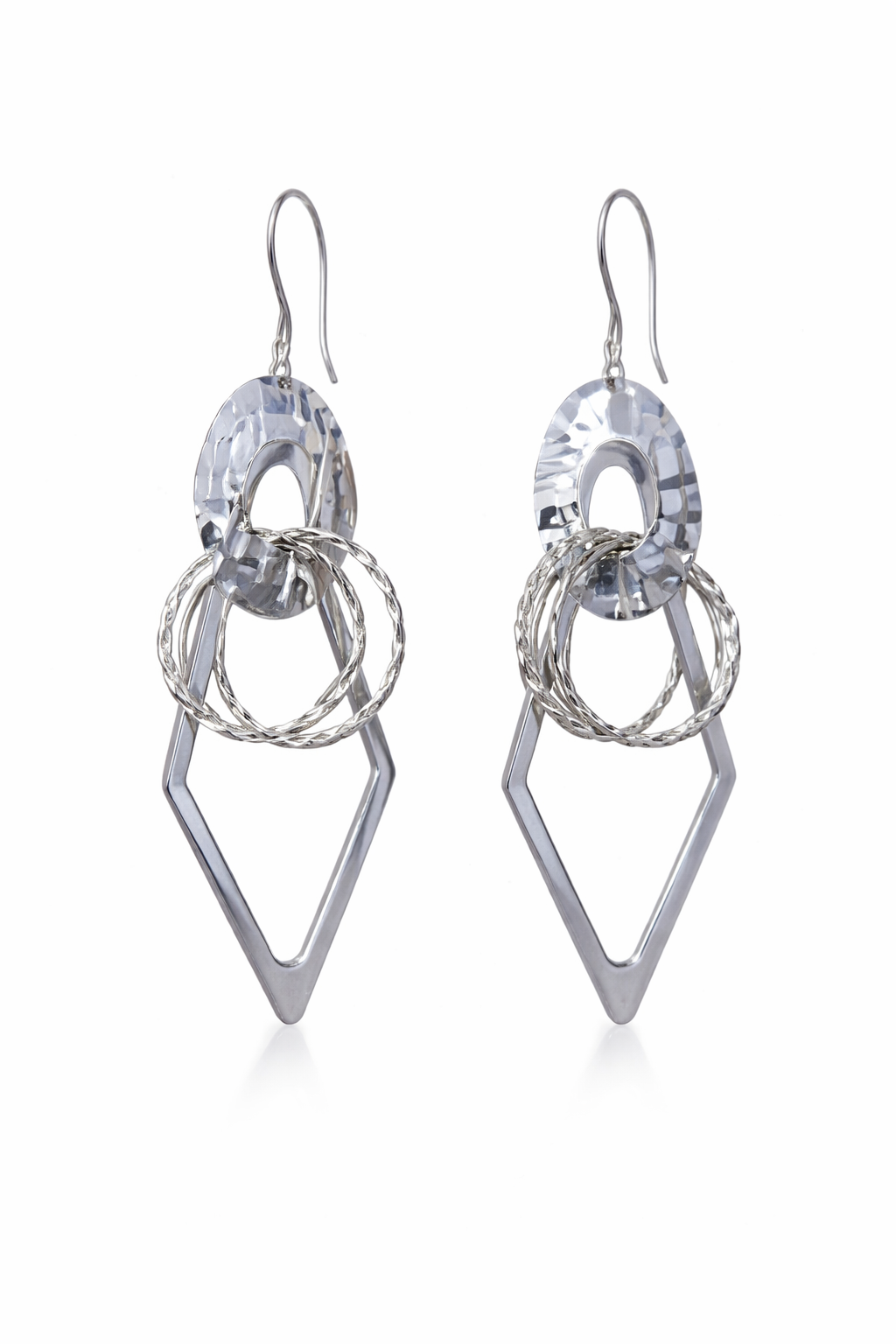 Aros colgantes se destacan por su diseño contemporáneo que combina formas geométricas y texturas para lograr una pieza única. La estructura presenta un aro superior que refleja la luz con elegancia, acompañado por argollas entrelazadas y un colgante en forma de rombo que estiliza el rostro.