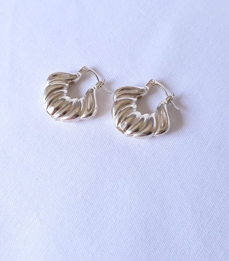 Aros de argolla plata inflada se destacan por su diseño irregular y textura marcada, que refleja la luz de forma sutil y crea un efecto sofisticado. Su estilo contemporáneo los convierte en el accesorio ideal para quienes buscan una pieza llamativa sin perder versatilidad.
