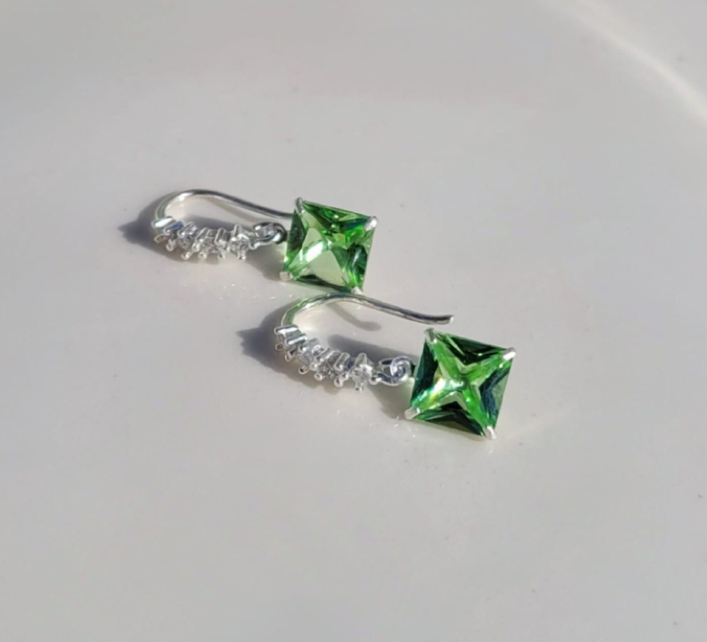 Aros colgantes con cubic cuadrado verde son la combinación perfecta entre elegancia y modernidad. Su piedra de corte cuadrado refleja la luz de manera sutil, creando un brillo atractivo que realza el diseño y aporta un detalle de color distinguido.