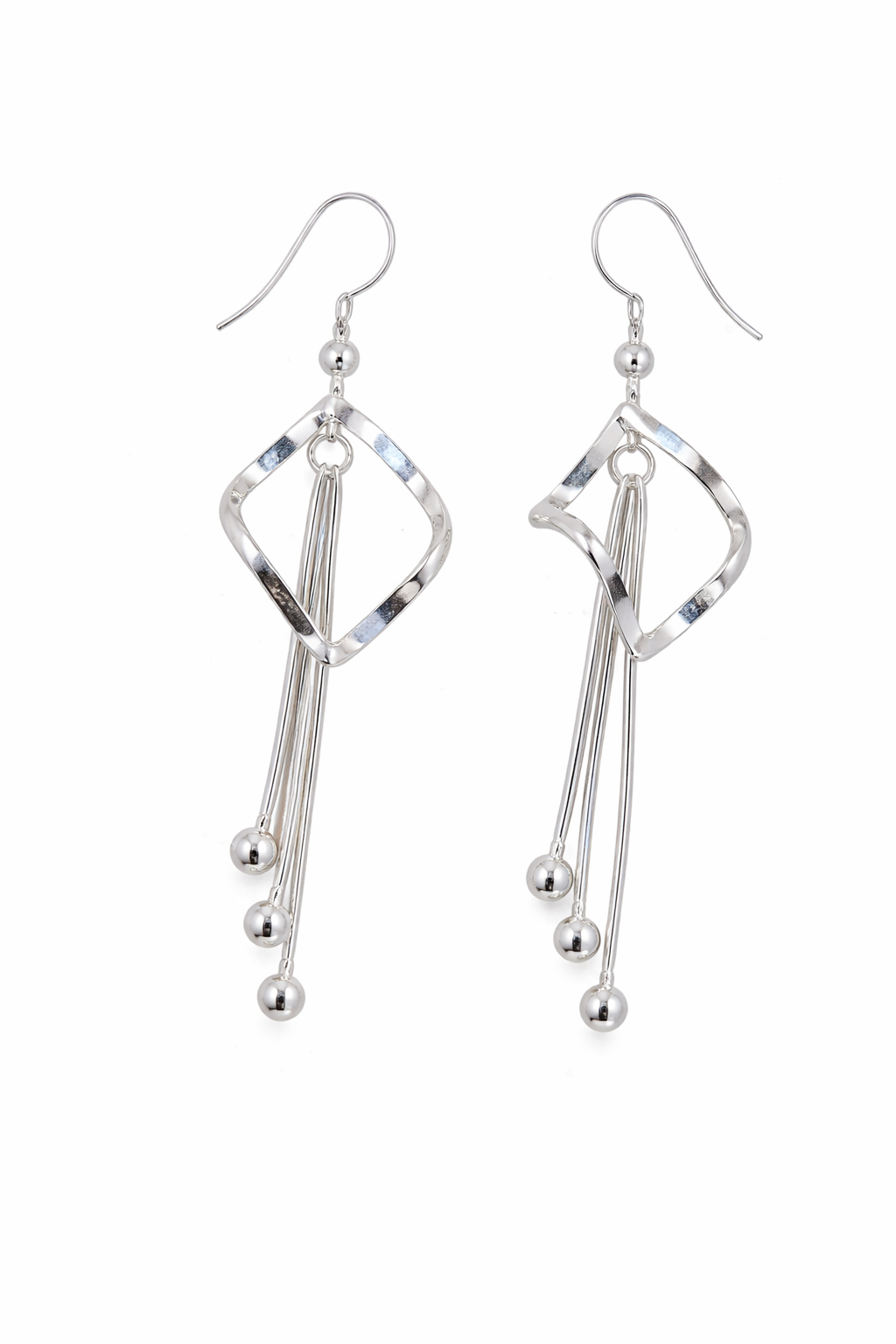 Aros colgantes Escencia de plata, el diseño presenta una figura geométrica central de acabado brillante, acompañada por finas tiras colgantes terminadas en pequeñas esferas que generan un movimiento sutil y atractivo.