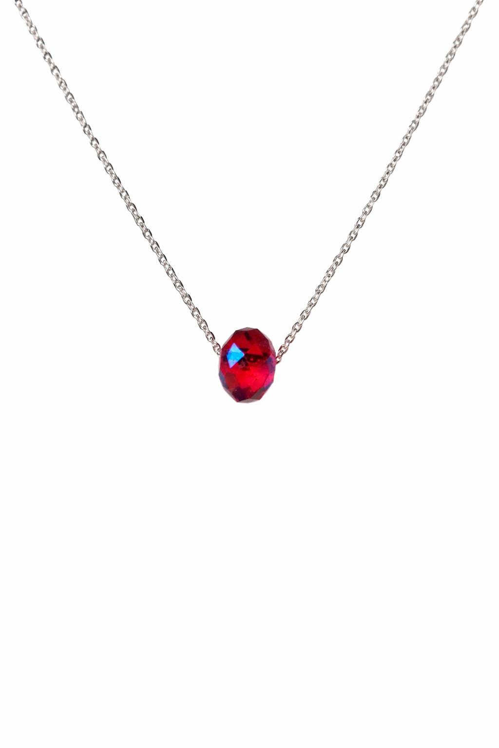 El dije cristal en forma de dona en tono rojo aporta un acento de color sofisticado que realza el escote y suma un aire contemporáneo.